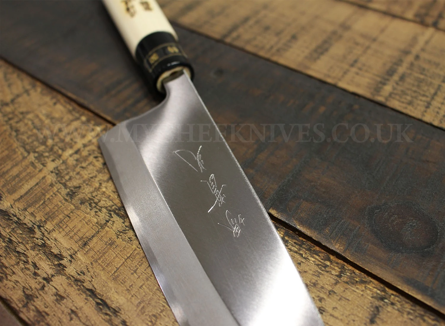 Moreover, to enhance the aesthetics of the knife, the blade’s surface has been engraved by the artisan to show the brand’s logo in Japanese. The engraving is directly made by hand using a punch and a small hammer, and because it is truly engraved in the steel and not just stamped, the logo will never fade away!