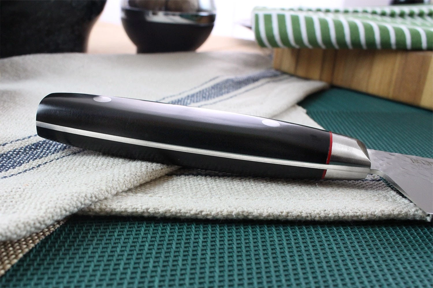 The blade has a hardness level of 60/61 HRC in the Rockwell scale, which is why the edge can remain sharp for a long period of time before needing to be honed again. Moreover, this high level of hardness also enables the blade to have an outstanding cutting performance as it penetrates the foods with ease and precision.