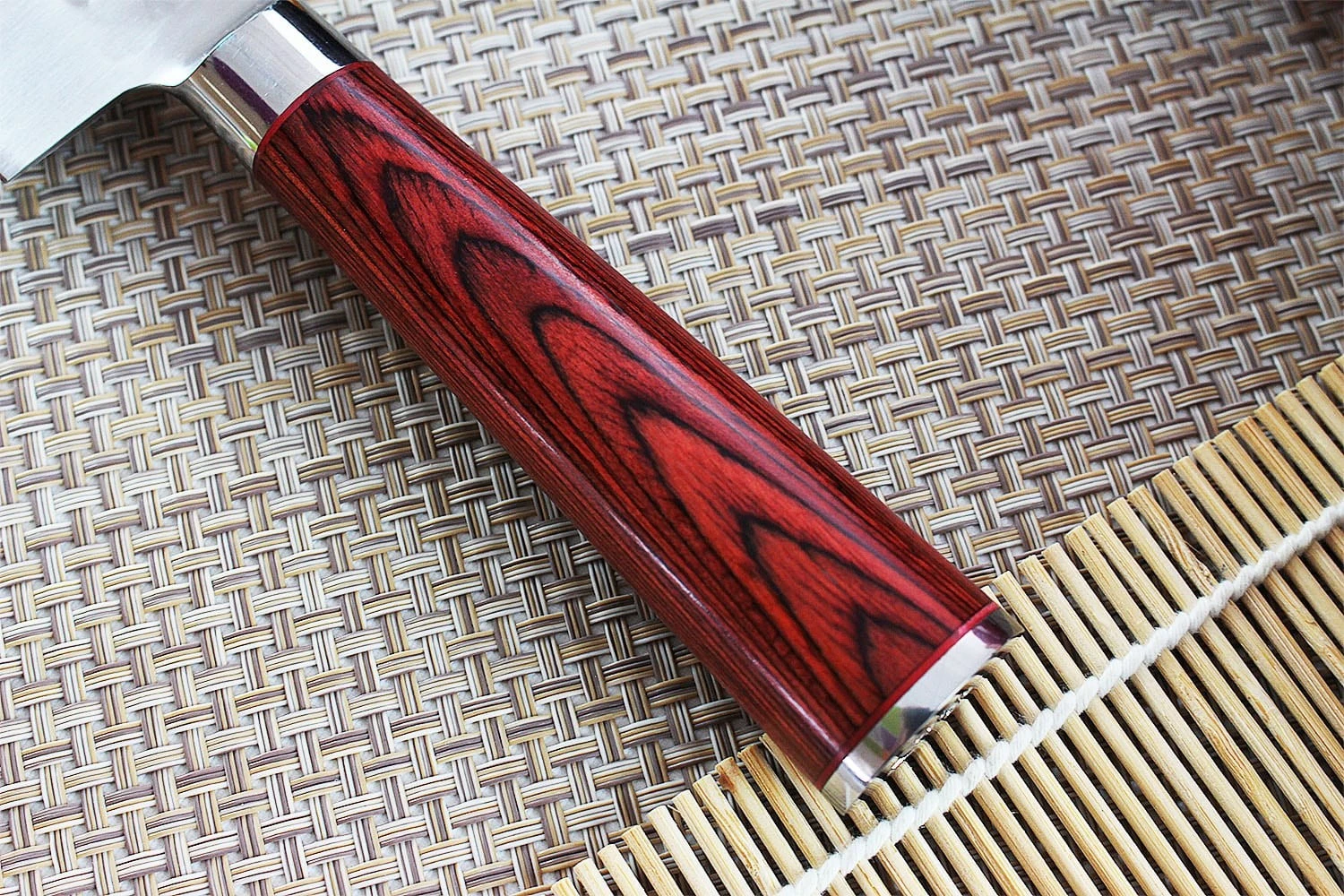 To complement the excellent blade, Wusaki have this knife a beautiful handle made of pakkawood. This composite material made of compressed resin and laminated wood has veinings on its surface, which give the knife an attractive look. This material is also known for its anti-bacterial properties and its resistance to the changes in temperature. The handle has also been varnished to add an extra layer of protection against humidity and stains.